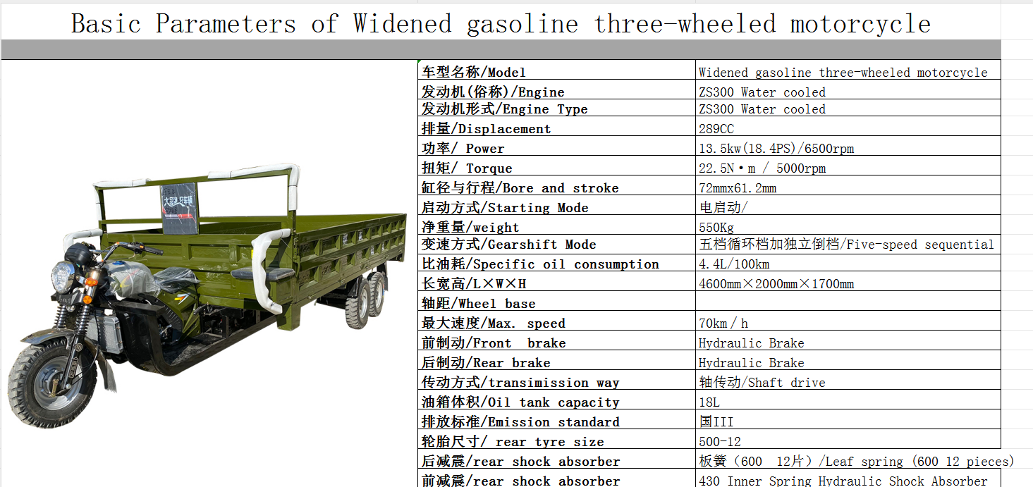 | 三轮摩托车 | Widened gasoline three-wheeled motorcycle |